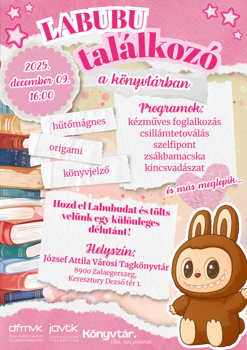 ✂️ Kézműves foglalkozás (készíthetünk hűtőmágnest, origamit, könyvjelzőt!), ✨csillámtetoválás 📸 Labubu szelfipont, 🎁 zsákbamacska és kincsvadászat ...és még sok más meglepetés!
